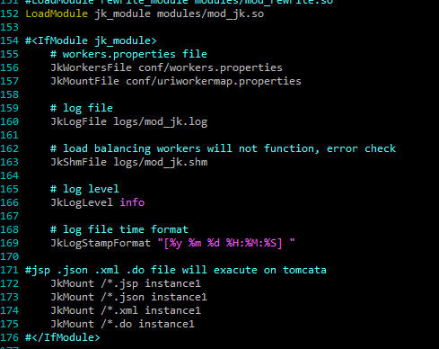 worker 이름: worker 이름은 정하기 나름이지만 각각 뒷단의 Tomcat 서버를 구분할 수 있는 이름이여야 한다. 이 worker 이름은 나중에 로드밸런싱을 할때에 Tomcat 에도 적용되어지는 이름이기에 잘 설정해야 한다.