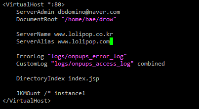 중요한 부분은 DocumentRoot 의 값이 웹 파일이 들어갈 경로이다. tomcat과 같이 "/home/webpolder/drow"가 되도록 입력해주자.