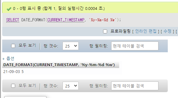 | %d | Day 일(00, 01, 02 ...) | %w | Day Of Week (0, 1, 2) 0부터 일요일 |
