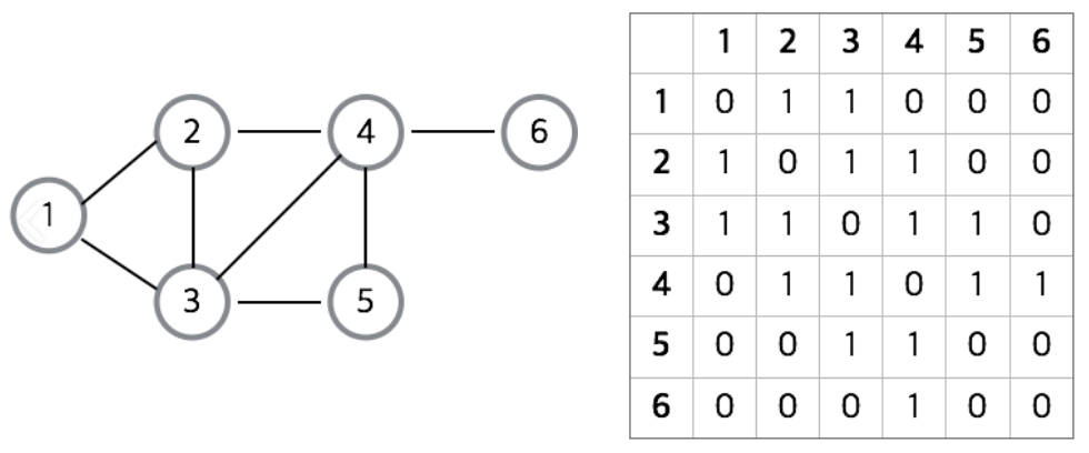 인접행렬은 그래프의 노드를 2차원 배열로 만든 것이다. 완성된 배열의 모양은 1, 2, 3, 4, 5, 6의 정점을 연결하는 노드에
