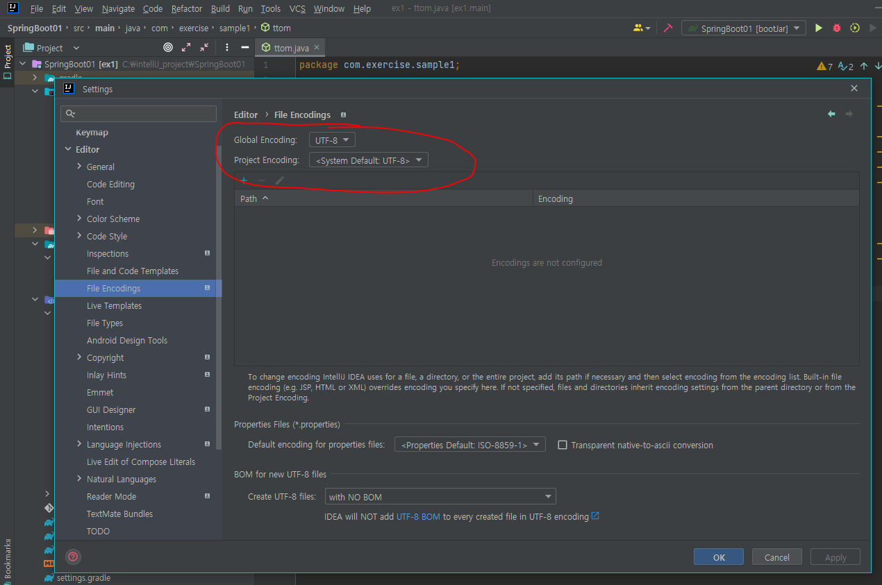 IntelliJ로 개발하면서 Eclipse처럼 별도로 인코딩을 지정해줘야 한다.