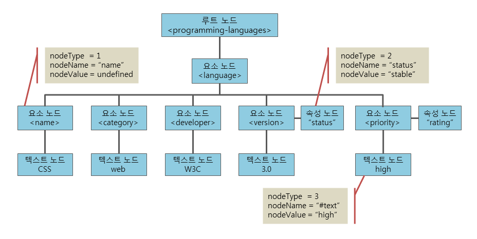 다음 그림은 우리 수업에서 계속 사용하고 있는 XML 파일에서 각 노드 타입의 프로퍼티 값을 보여주는 예제 그림입니다.
