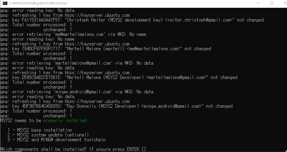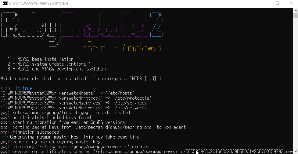 cmd창에서 1 누르고 (MSYS2 base installation) 엔터 누르면 설치가된다.