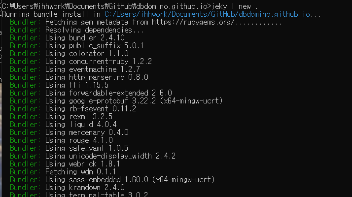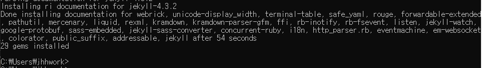 혹시나 아래처럼 안나오고 추가로 더설치하라는 화면나오면, cmd를 껏다가 다시켜서 jekyll을 실행해보자.