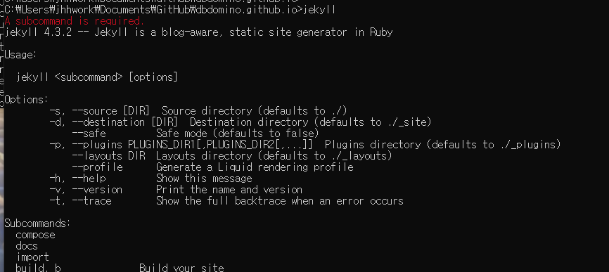 jekyll을 설치하고나면 아래처럼 jekyll 명령어 사용이 가능해진다.