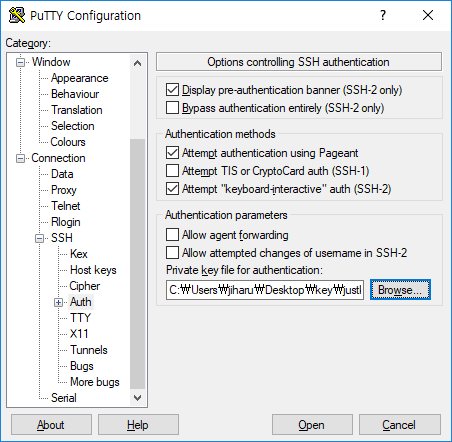 일반적인 ssh와는 다르게 접속하기 전에 Auth에 들어가서 ppk를 Browse를 눌러서 선택해준다.