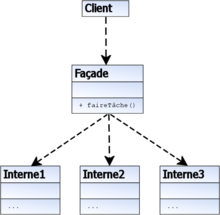 소프트웨어 공학 디자인 패턴 중 하나이며, client 는 facade(퍼사드, 정면) 만 바라보고 원하는 기능을 요청하면 그 뒤의 다양한 경로들의 접근은 신경쓰지 않아도 되는 방식이다.