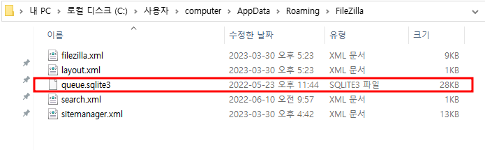 윈도우 탐색기를 열어 C:\Users\computer\AppData\Roaming\FileZilla 경로를 살펴보면, queue.sqlite3 파일이 있습니다만, 업데이트된 날짜가 한참 이전으로 확인되었습니다.