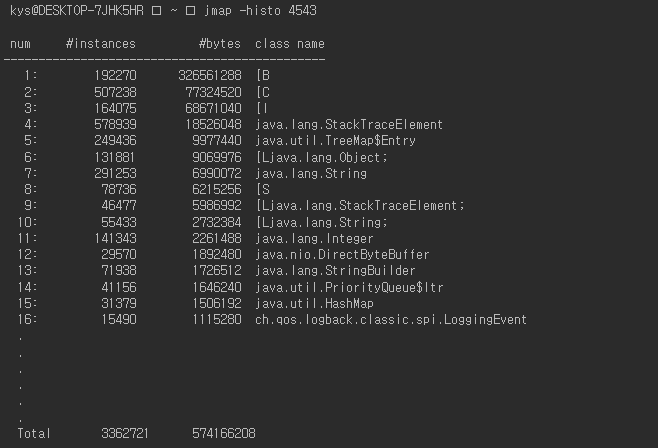 jmap의 histo옵션으로 분석도구 없이도 메모리 사용중인 리스트를 볼 수 있는데, 사용방법은 다음과 같다.