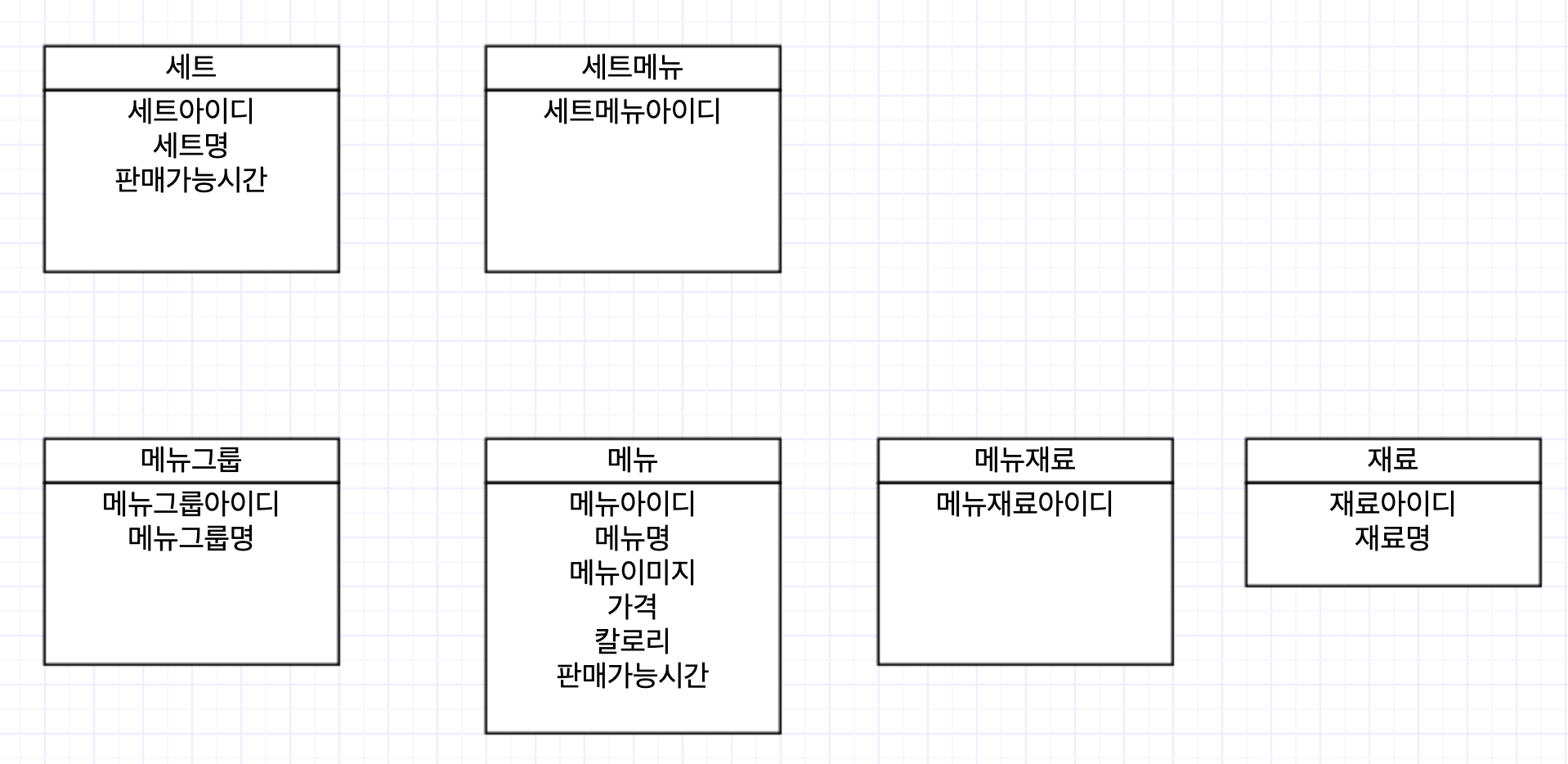 맥도날드 키오스크 프로그램을 만든다고 가정해보자. 단순히 예시가 아니라 외주를 받아 돈을 받고 프로그램을 만든다고 생각해보자. 기획자가 말하는 모든 요구사항을 구현하기 위해서는 DB에 적절히 데이터가 담길 수 있어야 한다. 편의를 위해 주문, 결제 부분은 제외했다.