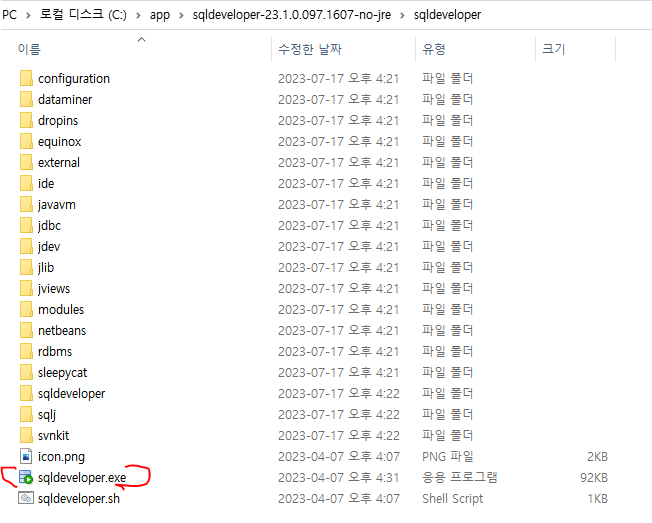 압축을 풀고 들어가보면 sqldeveloper.exe 파일이 보입니다.