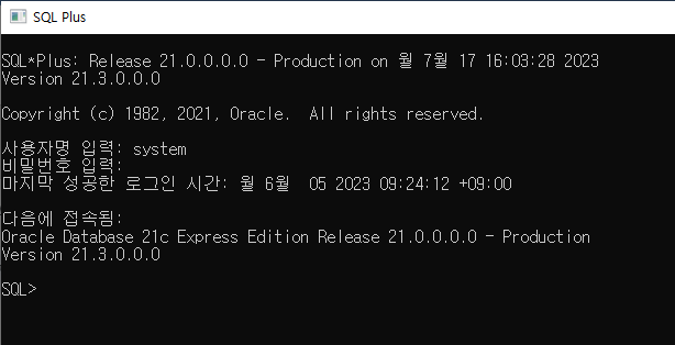 SQL Plus를 실행시켜서 system 계정으로 접속되는지 확인해봅시다.