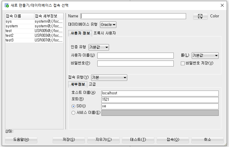 새 접속을 눌러서 접속 정보를 추가합시다.