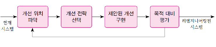- 리엔지니어링 - SW의 특정 측면을 개선하기 위해 재구축하는 과정