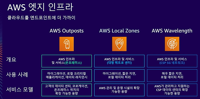 AWS Local Zones 대형 메트로 센터 사용, 엣지 서비스. 미국 서비스, 한국은 없음.