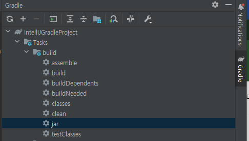 IntelliJ IDE 를 사용할 경우 우측 Gradle 항목을 클릭후 Tasks/build/에서 jar더블클릭 시 Jar 파일로 빌드가 진행됩니다.