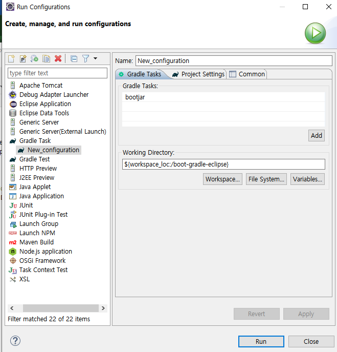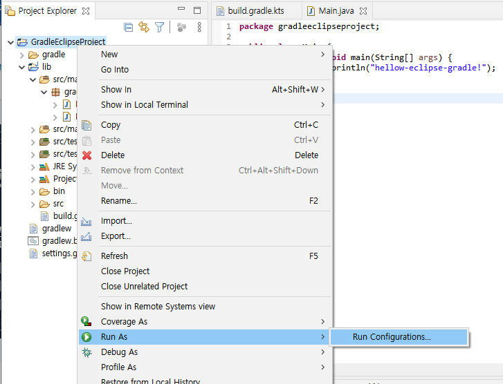 이클립스에서 gradle 기반 프로젝트를 생성한 뒤, run as 설정을 클릭합니다.