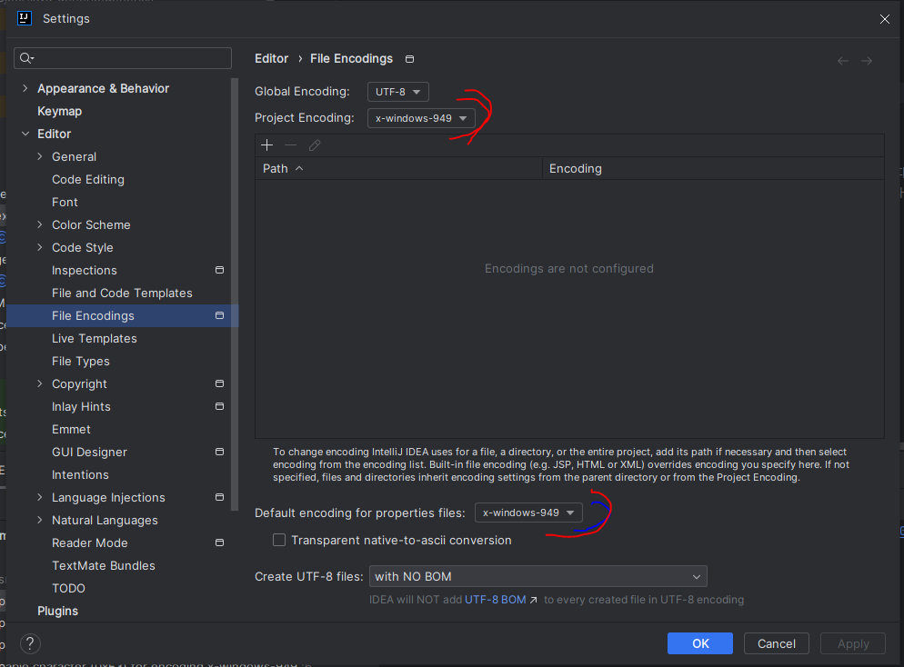 Setting > Editor > File Encodings 의 세팅 영역에 인코딩이 x-windows-949로 되어있어 그런 것이었고,
