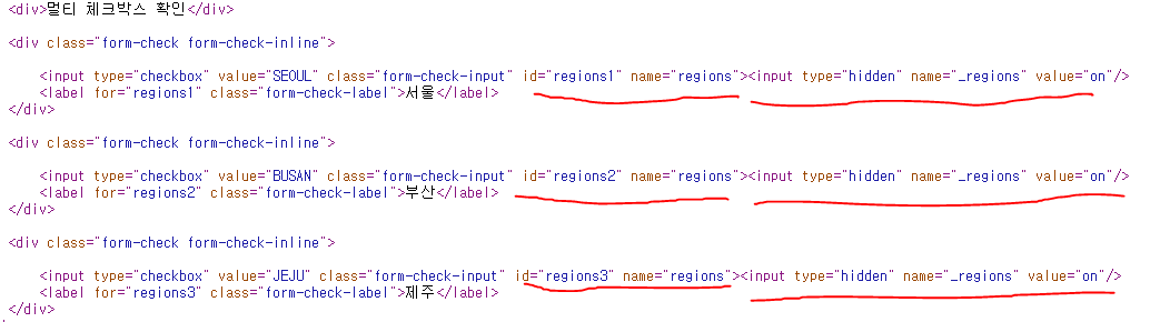 그림을 보면, regions라는 name으로 묶여 id, name이 자동으로 할당되었고, hidden input 도 자동으로 들어갔습니다.