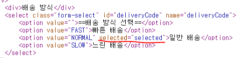 th:each="deliveryCode : ${deliveryCodes}" 이 코드에 따라서 모델에 넣어진 deliveryCodes가 출력 될텐데, 거기에 value에 맞는 옵션이 있다면 자동으로 selected를 설정해 준다는 것입니다.