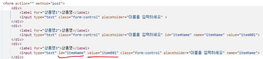 id : th:field 에서 지정한 변수 이름과 같다. id="itemName"