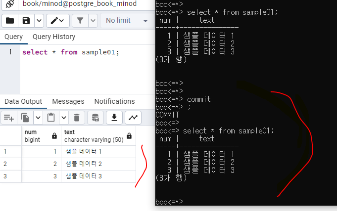 commit 상태에 따라 데이터가 조회 되는것이 구분됩니다.