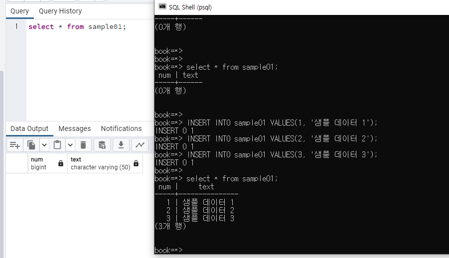 psql로 등록 후 pqAdmin4 에서 다시 조회해보겠습니다.