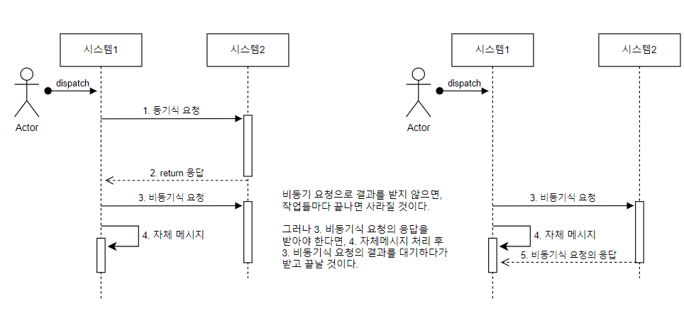 - 동기 메시지(Synchronous Message): 메시지를 보낸 객체가 메시지의 응답을 기다립니다. 동기 메시지 호출은 꽉찬 화살표에 실선으로 표시합니다.