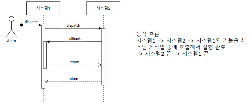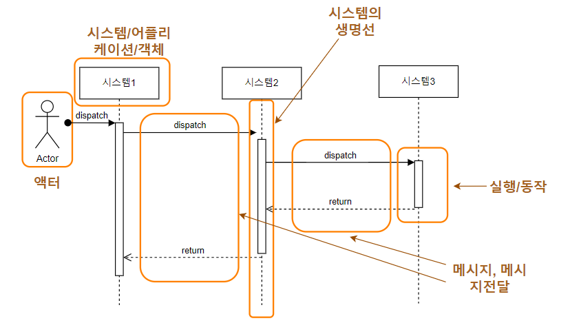 - 시스템(시스템, 어플리케이션, 객체) : 각 어플리케이션, 또는 외부 서비스, 서버, 시스템이 될 수 있으며, 각 각 생명선과 실행/동작을 갖습니다.