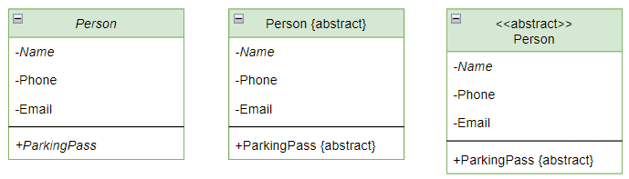 추상 클래스를 나타내는 방법은 총 3가지로 이탤릭체(기울어진 글씨)로 표시하거나 클래스 명에 {abstract}을 붙이거나 길러멧으로 표시합니다.