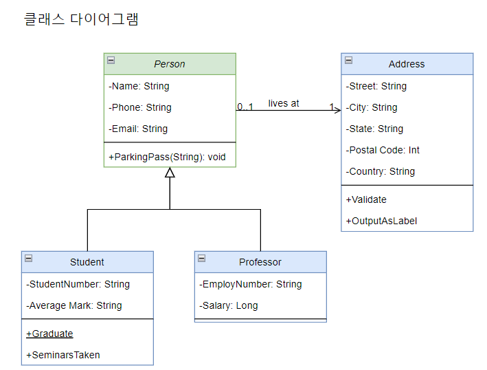 이런 규칙을 적용하여 최종적으로 아래처럼 클래스 다이어그램을 그리고, 해석할 수 있겠습니다.