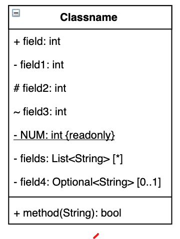 앞에 +, -, #이 붙는데 +는 public, -는 private, #은 protected, ~는 default를 의미합니다.